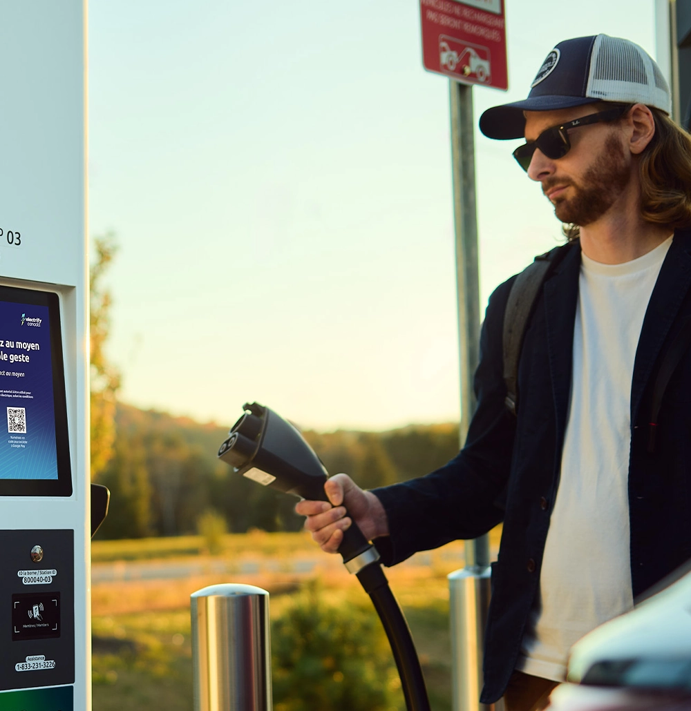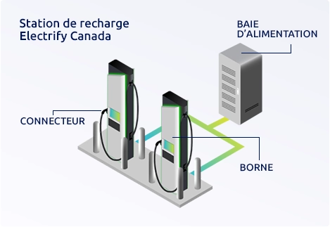 L’expérience de recharge d’Electrify Canada a été créée en fonction de vous. Lorsque vous arriverez à l’une de nos bornes de recharge, vous sélectionnerez d’abord une borne. Une fois que vous aurez branché le connecteur de la borne sur le port de recharge de votre véhicule, la borne tirera l’énergie de la baie d’alimentation.