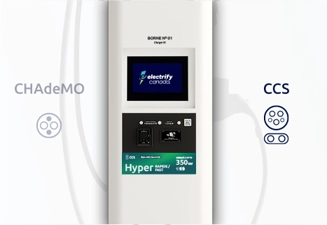 Nos bornes rapides CC sont dotés de deux types de connecteurs : Système de recharge combiné (CCS) et prise de recharge (CHAdeMO). Les deux connecteurs se trouvent dans la plupart des stations de recharge Electrify Canada. On les reconnaît grâce à leur étiquette turquoise, verte et bleue sur les bornes.